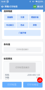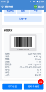 11.标签预览 详情参考:打印标签预览;注意:在本次操作中,系统将直接采用用户手动输入的宽幅和米数,而面密度需进行计算。
