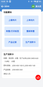 在页面中,点击 “上裁布片”,“上单向片”,“称重/打印标签”,“重新称重”,“产品记录”和“生产流转卡”,进入相应的功能页面。