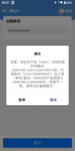 3.当扫描条码提示“原料规格与条码对应的产品规格不一致”时,点击“放弃”按钮将结束本次扫描操作,点击“继续”按钮则会继续执行当前操作,本次扫描条码不会被强制放弃,请在核对条码信息后谨慎提交!