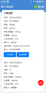 2、扫描原料入库明细条形码出现该记录详细信息