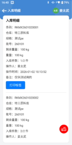 4、入库明细页面点击打印标签会打印出对应明细的条形码