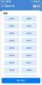 在选择生产线页面,若账号已由后台管理员配置 配胶权限,则页面中会显示 “配胶”入口。点击对应的 配胶UU生产线,进入 配胶页面 进行操作。
